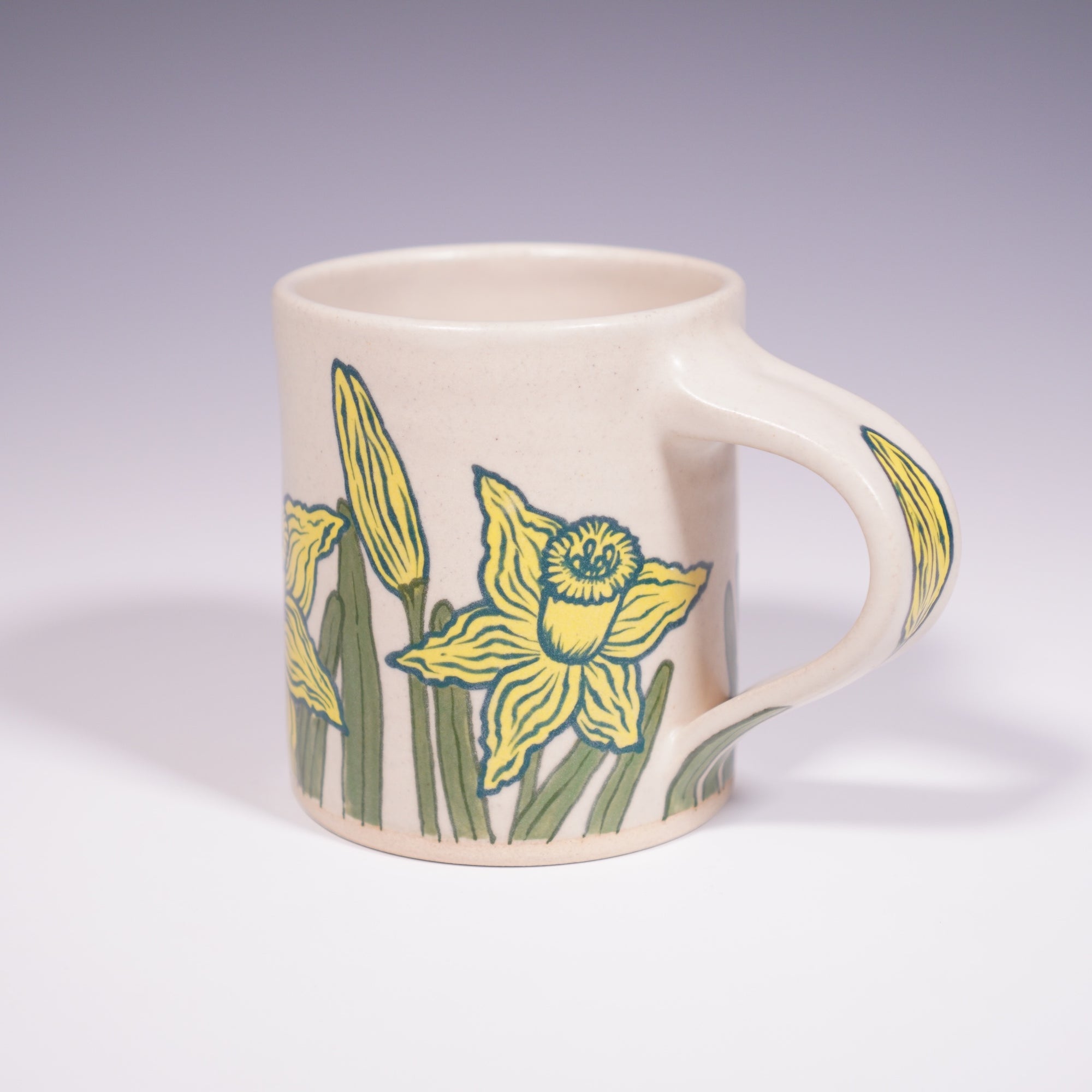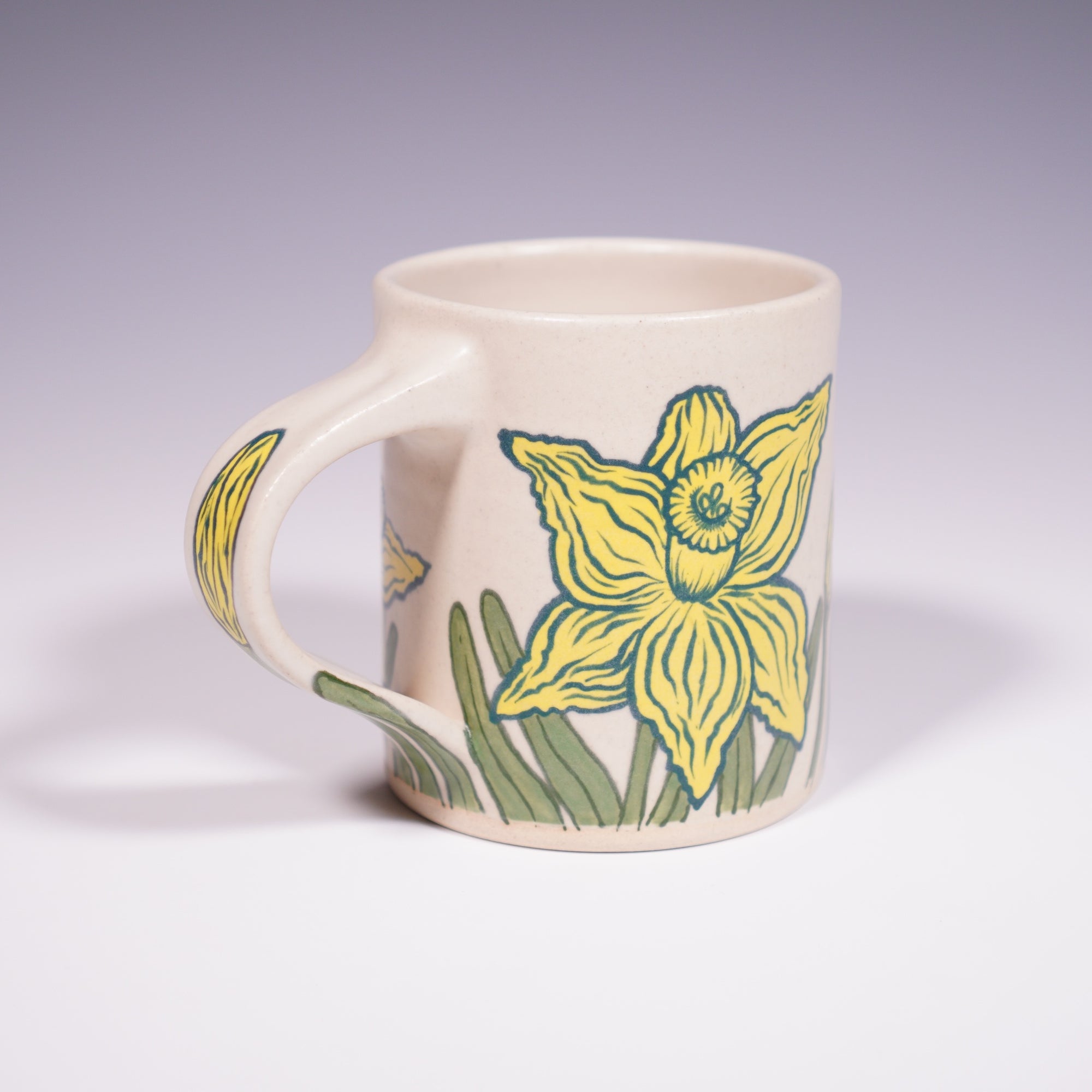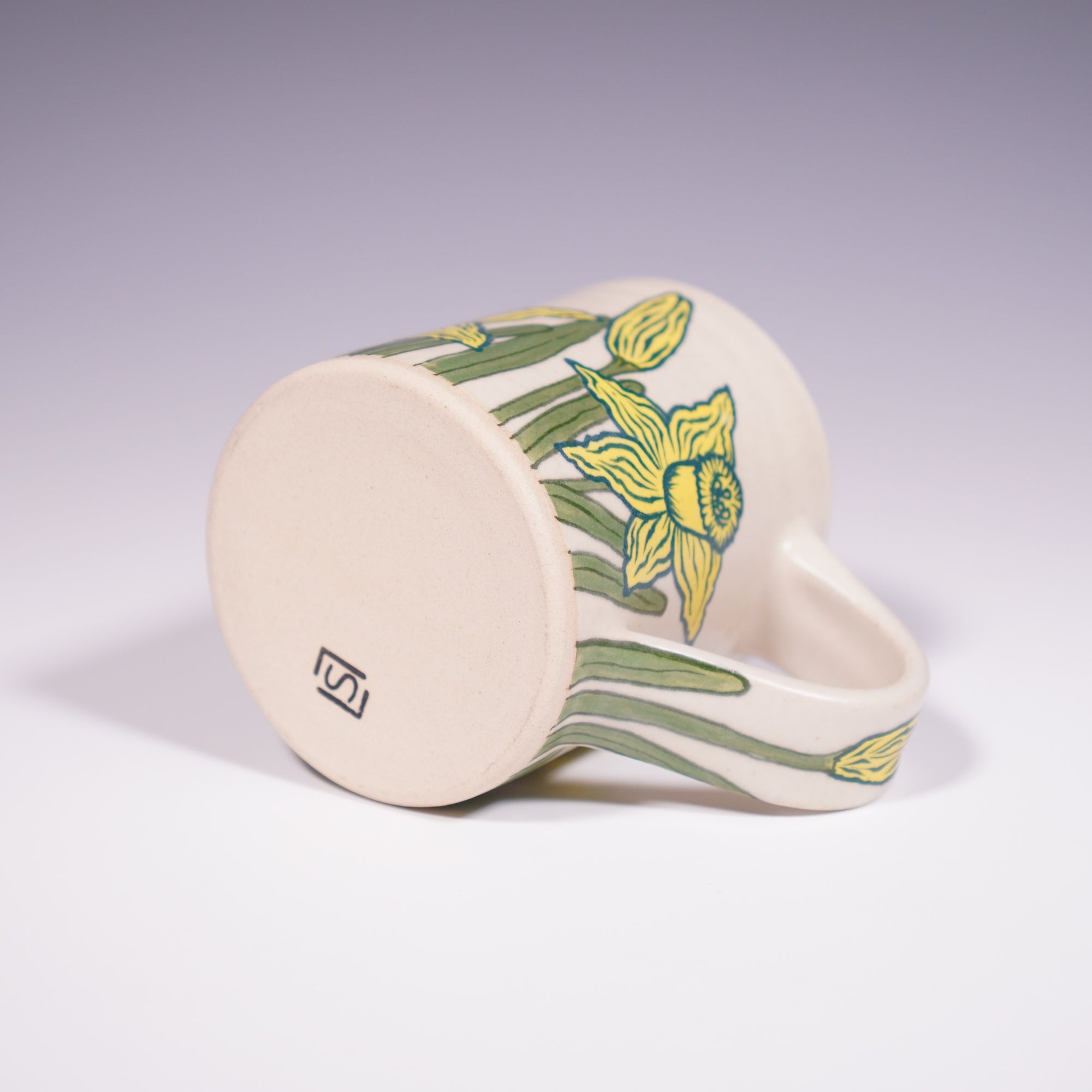 This one of a kind stoneware mug was wheel thrown & hand painted with underglaze motifs. Made with beautiful white clay.