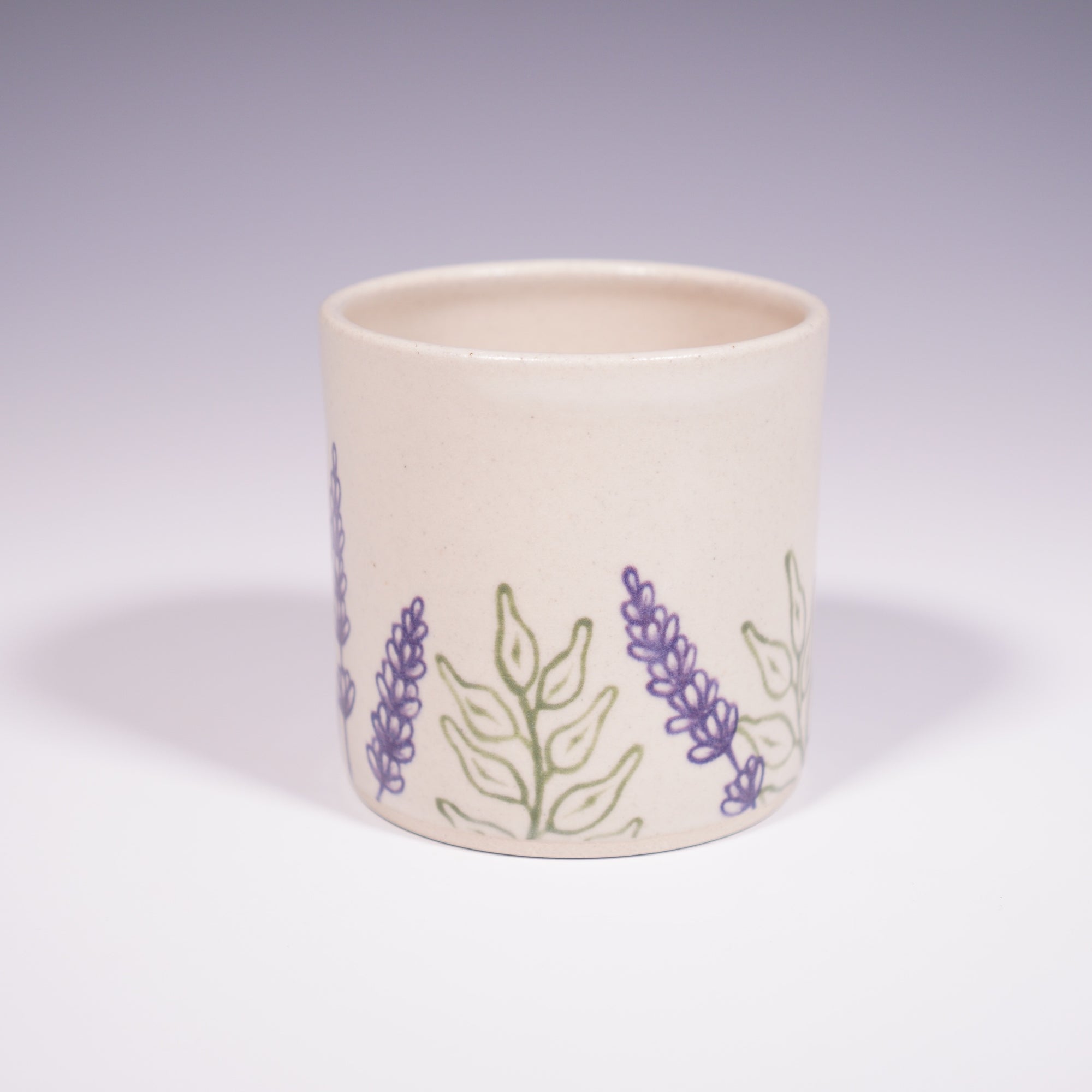 This one of a kind stoneware tumbler was wheel thrown & hand painted with underglaze motifs. Made with beautiful white clay.